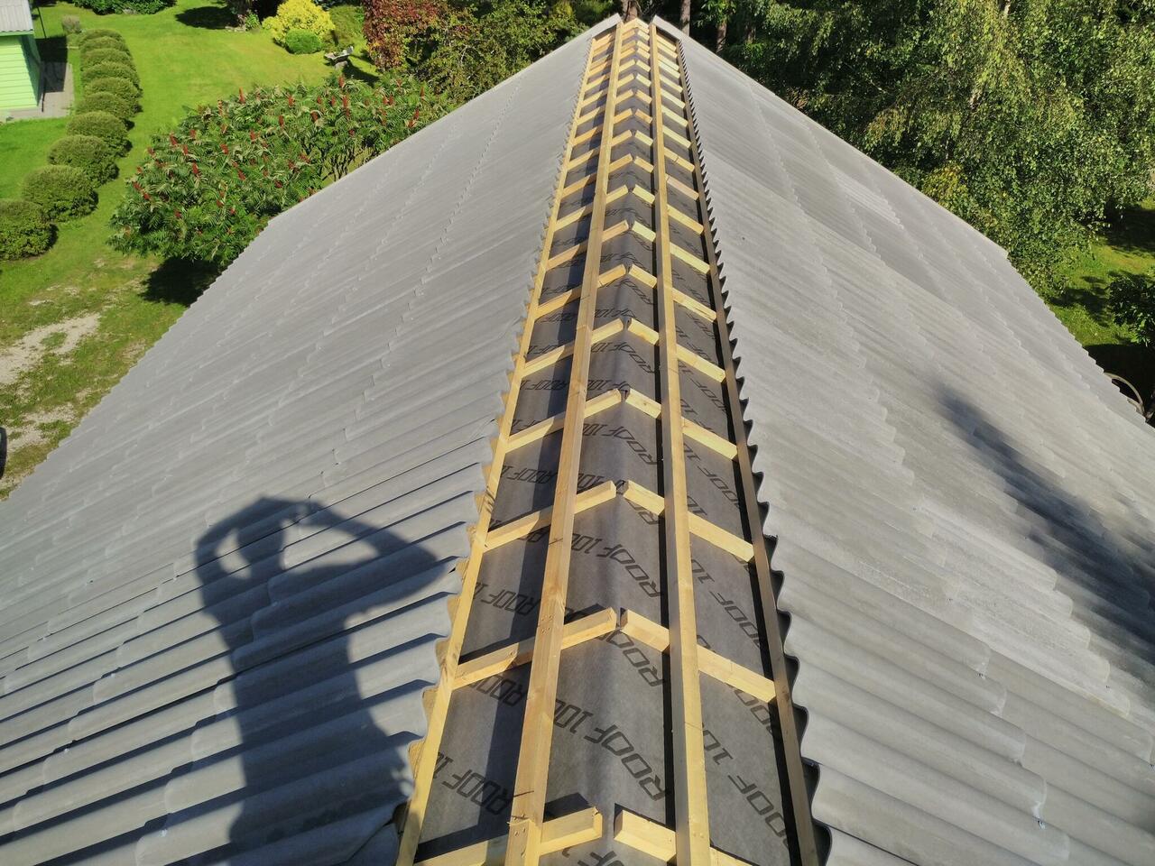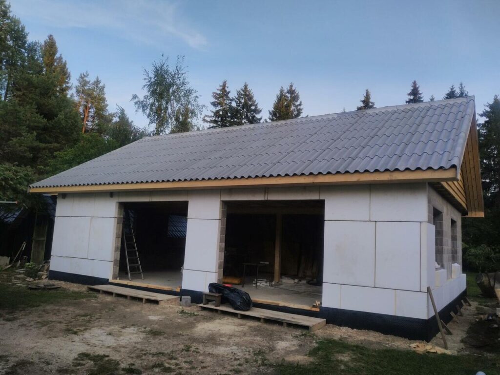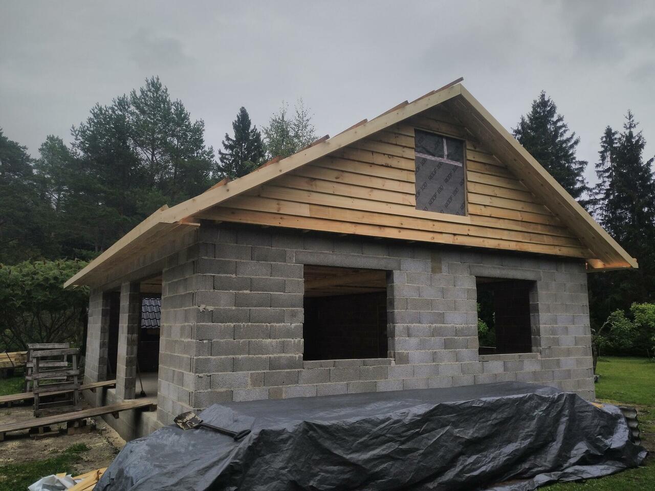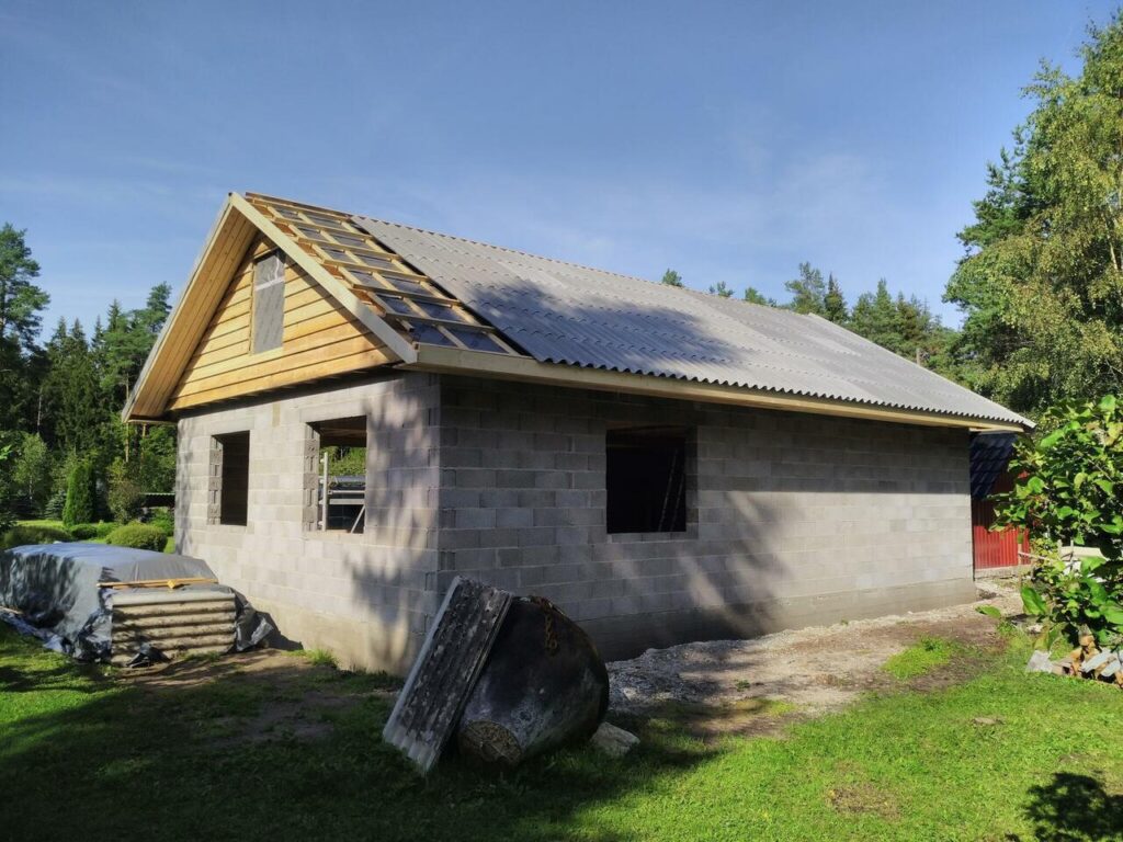 Katus viimistletud Leedu eterniidiga Villa tsement hall. Kasutatud eterniidist serva ning harjadetaile ühtse tulemuse saamiseks.